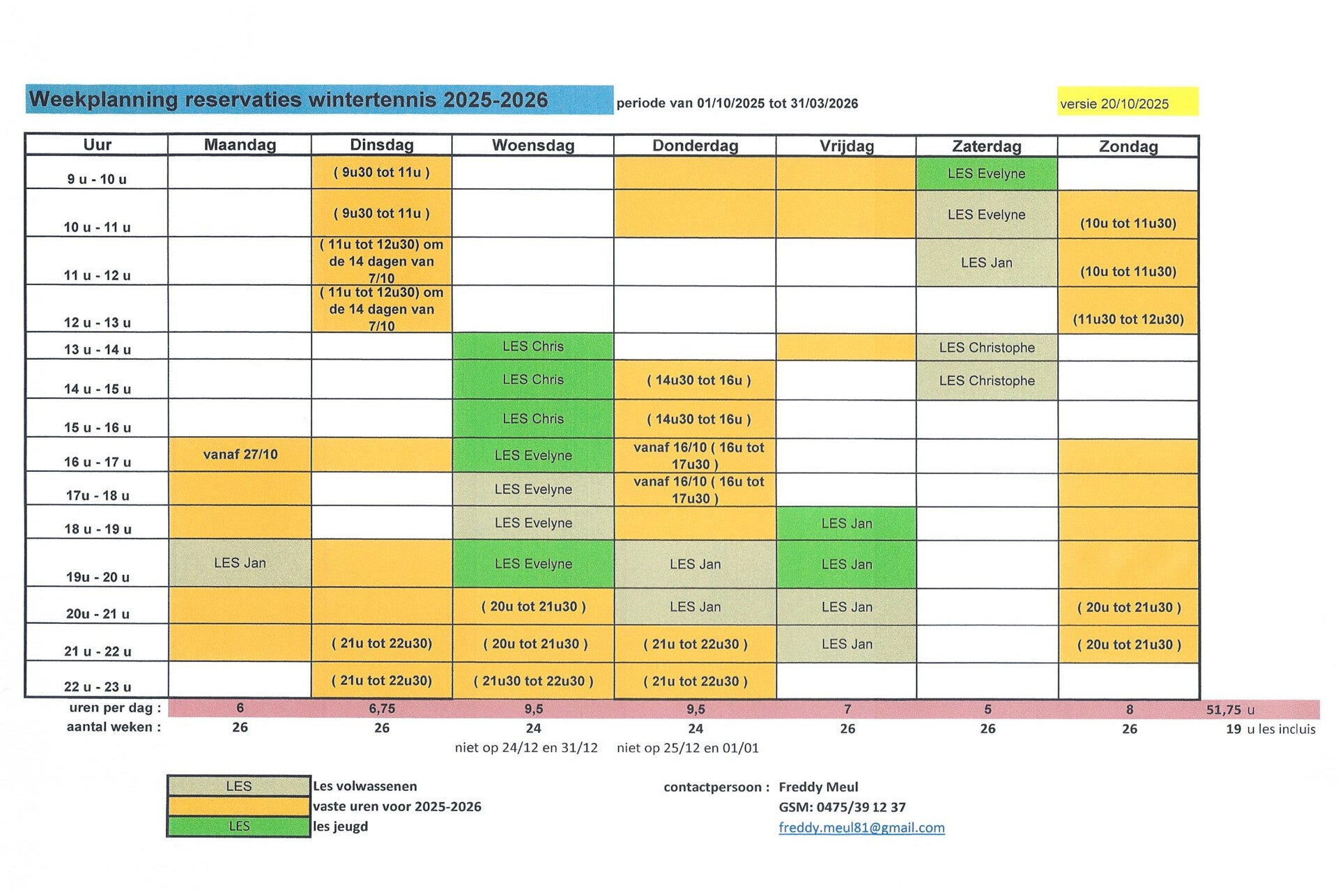 Planning bezetting tennishal periode van 01/10/2025 tot 31/03/2026
